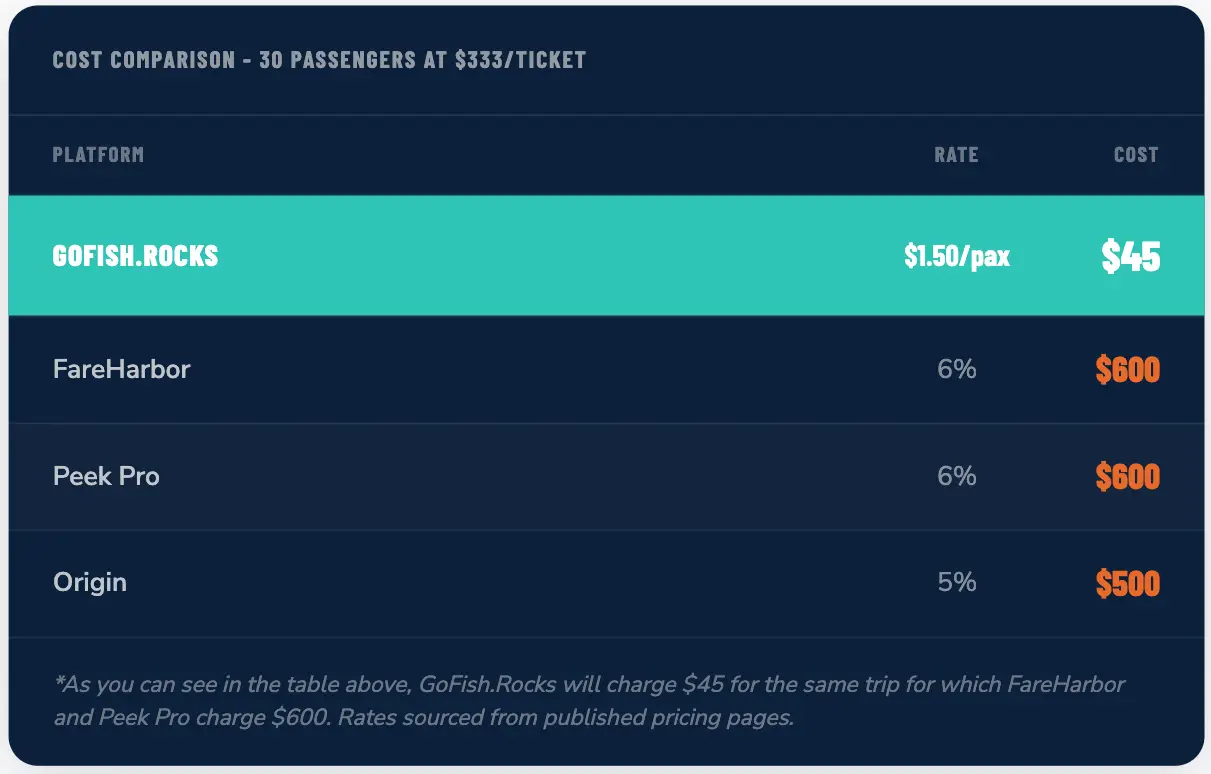 A 12-passenger, $2,000 charter costs you $18 with GoFish.Rocks. At FareHarbor's 6%, that same trip runs $120. Run the numbers across a full season, and the difference is significant.