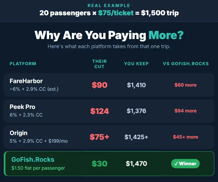Why give booking platforms 3%, 5%, or 6% of your revenue when GoFish.Rocks charges a flat $1.50 per passenger, per trip — no matter the trip fee, no matter the cost?