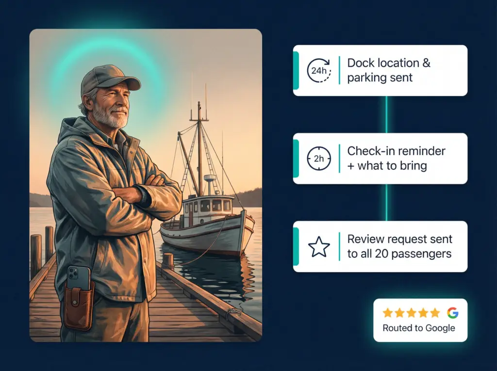 - Post-trip review requests go to the entire manifest with one click. Happy customers route to Google. Unhappy customers route to a private feedback page - so you intercept bad reviews before they go public.