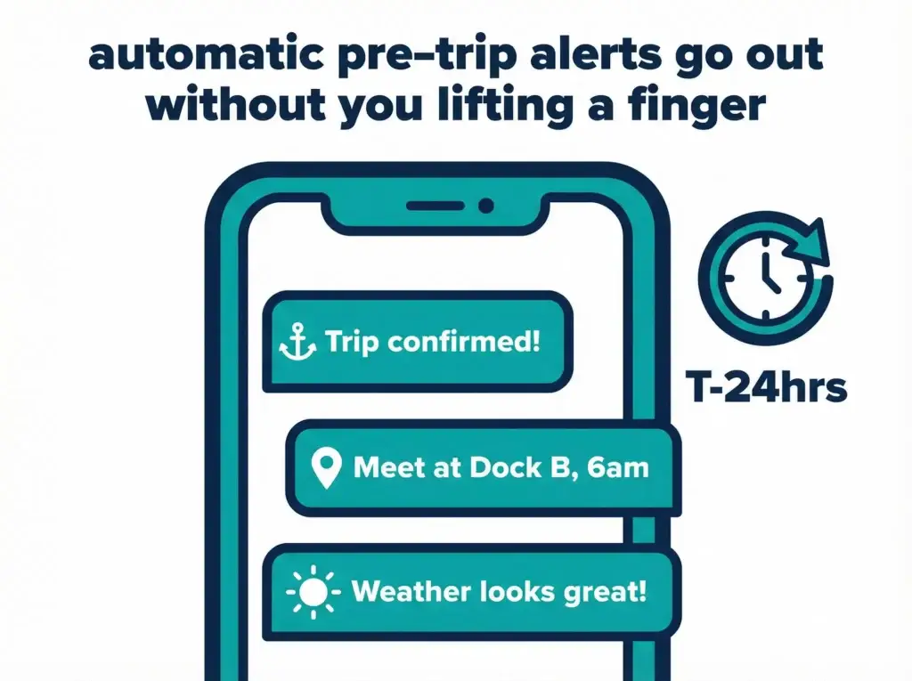 - Pre-boarding alerts fire automatically at 24 hours and 2 hours before departure - dock location, parking, check-in time, what to bring - so 65 passengers aren't all calling the office the morning of the trip.