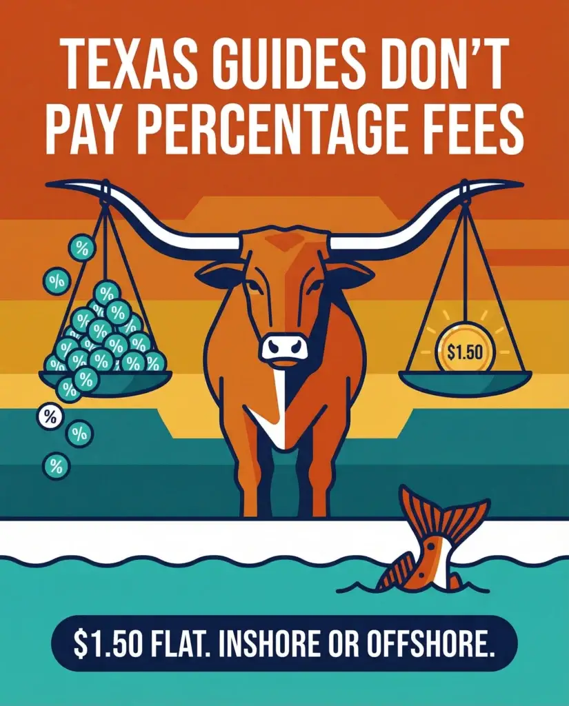 Texas inshore guides and offshore party boats run trips year-round along the Gulf Coast. At 6%, a 10-person inshore trip at $150 per head costs you $90 in platform fees before you pay for bait or gas.