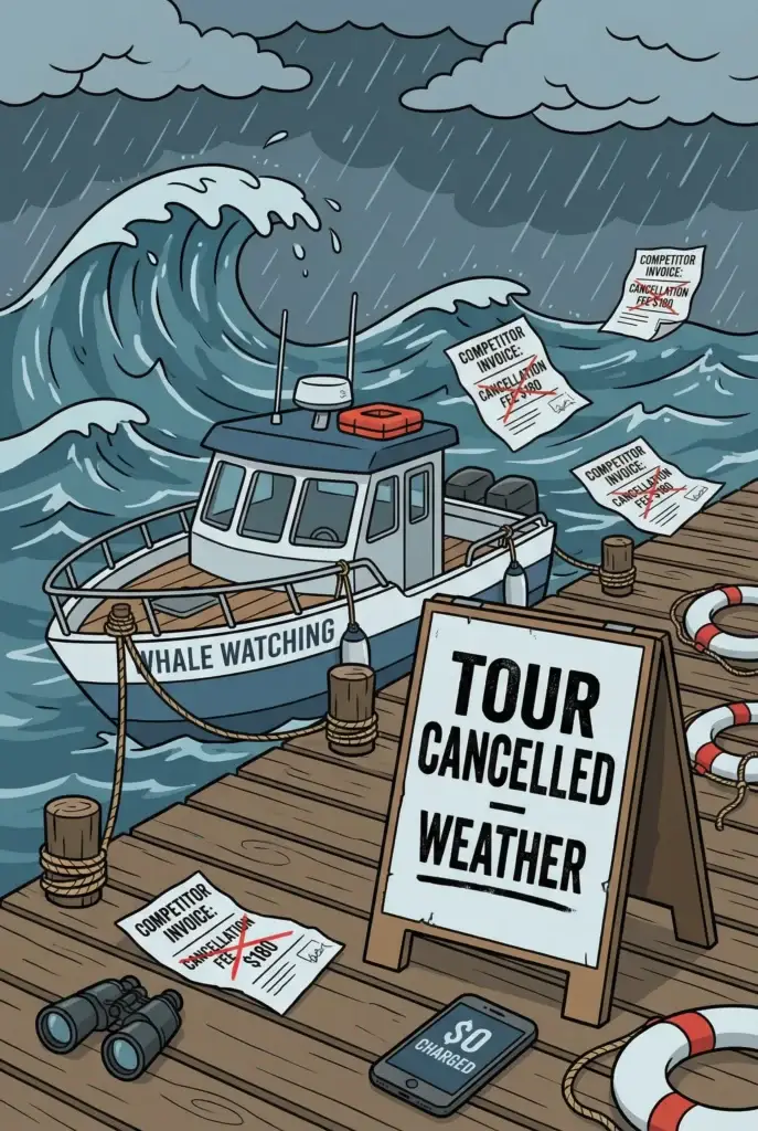 Weather cancellations are a daily reality in whale watching. GoFish.Rocks handles the communication so you’re not calling 120 guests at 5 AM.